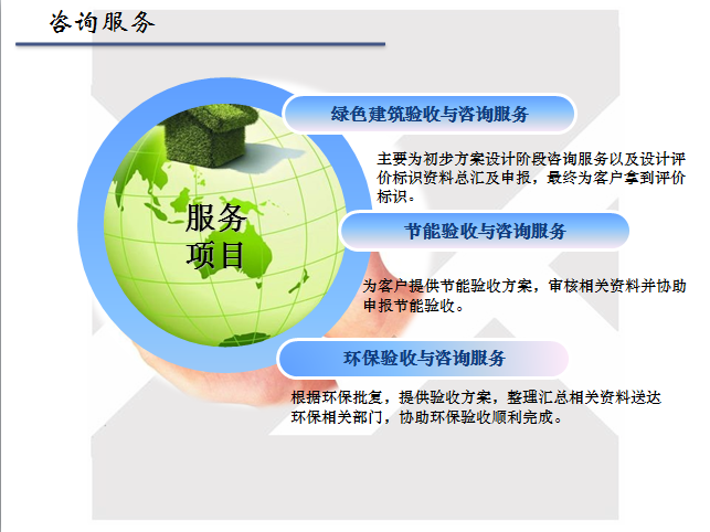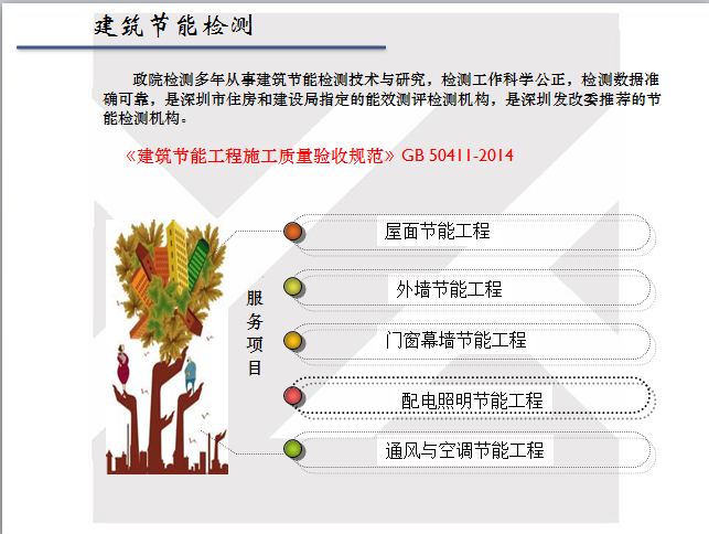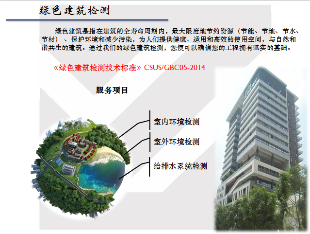 建筑工程檢測主要包含常規(guī)建材、主體結構、建筑節(jié)能、綠色建筑、建筑環(huán)保、裝飾裝修材料檢測等幾大項,其中以建筑節(jié)能檢測、綠色建筑檢測和節(jié)能環(huán)保咨詢驗收服務為主。